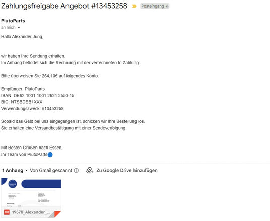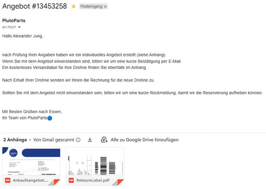 Nach der Prüfung Ihrer eingesendeten Drohne erhalten Sie per E-Mail eine Zahlungsfreigabe mit der Rechnung und den entsprechenden Zahlungsinformationen.