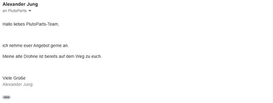 Innerhalb von 24 Stunden nach Ihrer Anfrage erhalten Sie unser Angebot. Anschließend senden Sie uns Ihre gebrauchte Drohne zu.