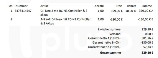 gegen eine gebrauchte DJI Neo mit RC-N2 Controller mit 3 Akkus & einer Zuzahlung von 229,10€